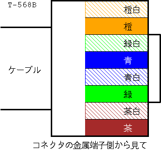 結構知られていることですが、 Ethernet用の8本の芯線が全て結線してあるストレートケーブルは、 ISDNのS/T点インターフェース用にも流用可能です。 (自宅で30mほど引き回しています。) ISDNでは真中の2ペア、つまり下のT-568Bの結線図で緑と青のペアを使います。 ISDN用にはCat. 5のケーブルは必要ないはずですが、 Ethernet用を流用した方が安く上がります。 なお、ISDNはよじっていないケーブルを期待しているらしいので、 この流用は保証の限りではありません。